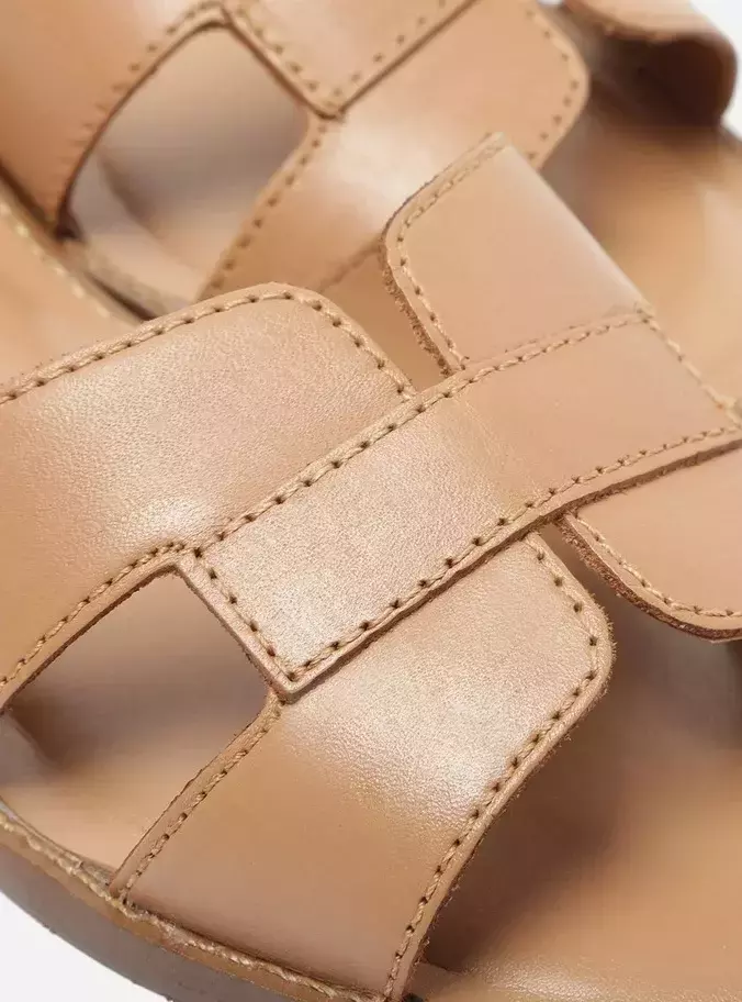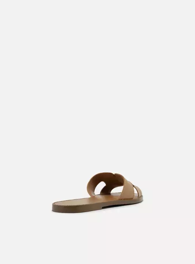 Rasteira preta. O modelo tem sola flat e formato arredondado na ponta. Traz cabedal em tiras vazadas no formato H, além de costuras pesponto por todo o contorno. Com palmilha na cor do modelo e inscrição do nome da marca. Aberta, exibe todo o pé.